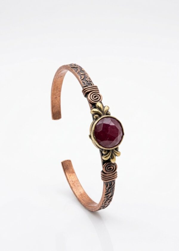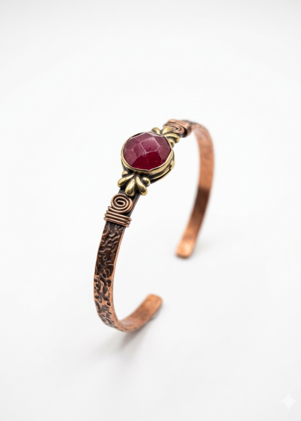 El İşçiliği Dövme Bakır Kelepçe Bileklik | Doğal Kırmızı Taşlı (Granat/Lal) Otantik Tasarım | Ayarlanabilir Boho Bilezik