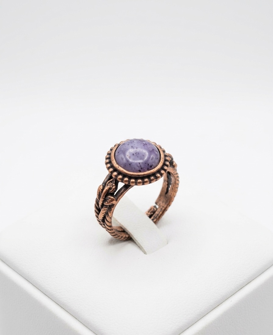 Otantik Mor Taşlı Bakır Yüzük, doğanın zarif dokunuşlarını ve geçmişin vintage ruhunu parmaklarınıza taşıyan çok özel bir tasarımdır. Gövdesini saran ince işçilikli yaprak motifleri ve merkezinde yer alan göz alıcı mor taşıyla, sıradanlıktan uzaklaşmak isteyenler için mükemmel bir seçenektir. ✨